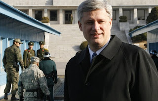 [above: Though he also spent at least a minute or so inside DPRK territory, Canadian PM Stephen Harper was not kidnapped, was not forced to eat rice with small stones in it, did not bond with his captors, did not force world leaders to come to his rescue, and did not get $1 publishing deal to write book on tragedy of North Korean defectors whom he endangered by carrying tapes of their interviews with him. On re-entering the South, however, he was forcibly tested for HIV and THC.]